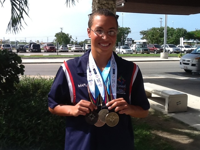 Alex, proudly displays his 4 relay medals of 1 Gold, 2 Silver, 1 Bronze and his smile reflects the outstanding swimming he, and the team, have produced in Bermuda.