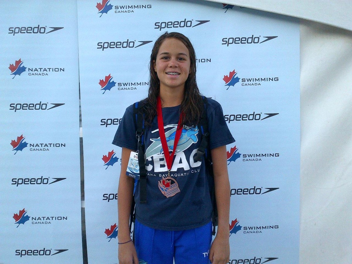 Lauren Hew powered her way to a bronze medal in the final of the 13yrs 50m backstroke at the Canadian National Age Group Championhips in Montreal, Canada.