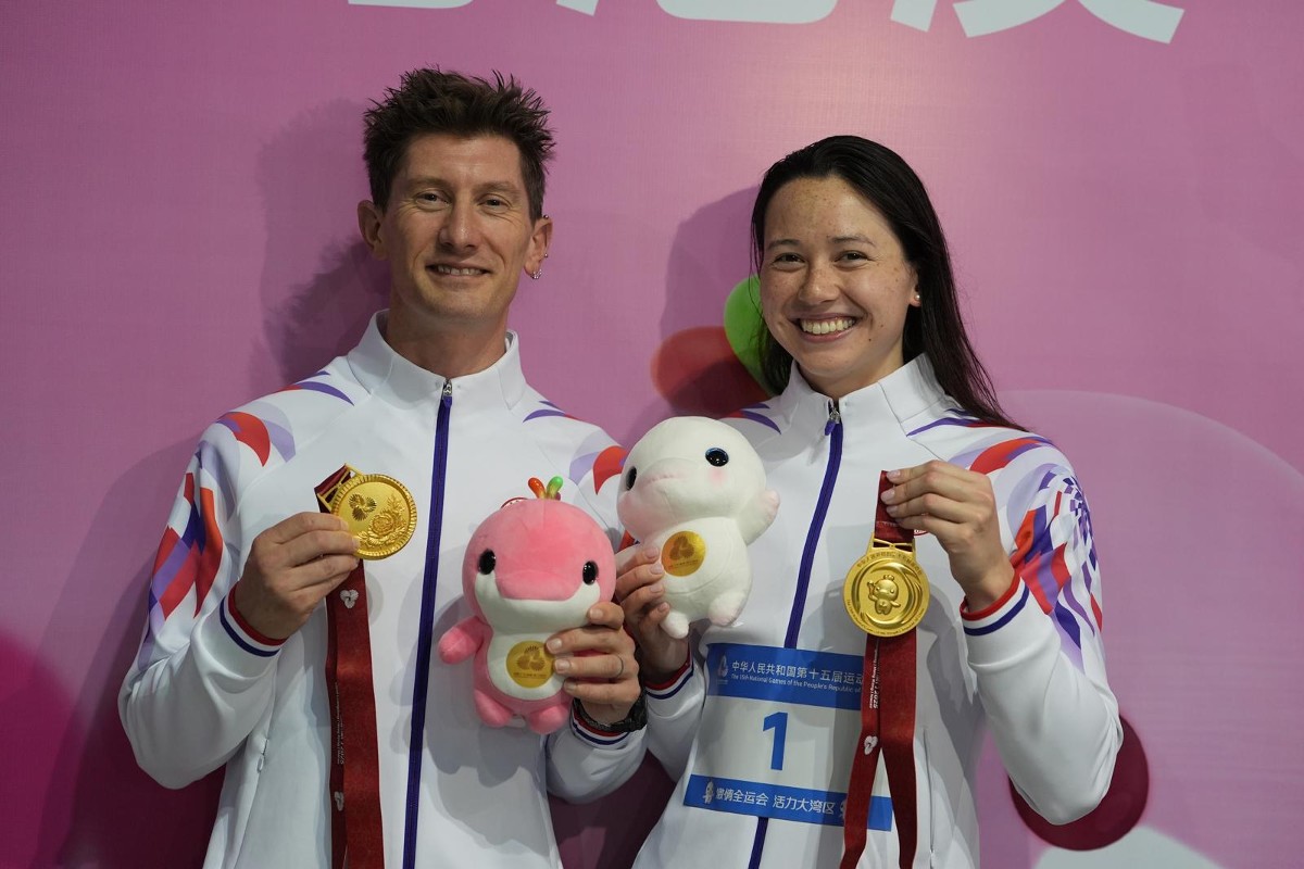 Seen here also at the medal ceremony with her coach Tom Rushton.