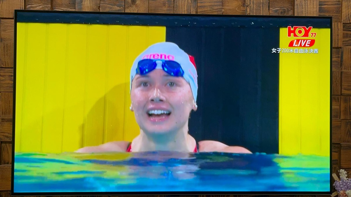 Freshly crowned National Games Champion in the 200 m Freestyle, Siobhan Haughey stunned the field with a very fast 100 m split and held on to her lead all the way into the finish. Time = 1:54.85.