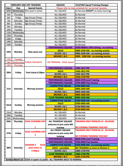 These include Chinese New Year week (16th - 22nd Feb) changes and SCAA cleaning days (26th, 27th, 28th)