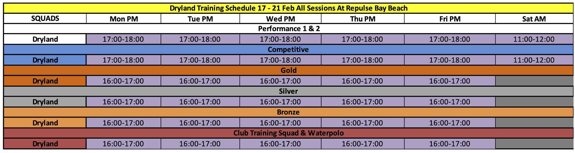 Please find attached the group dryland schedule for this week. We are offering group sessions everyday at Repulse Bay beach: