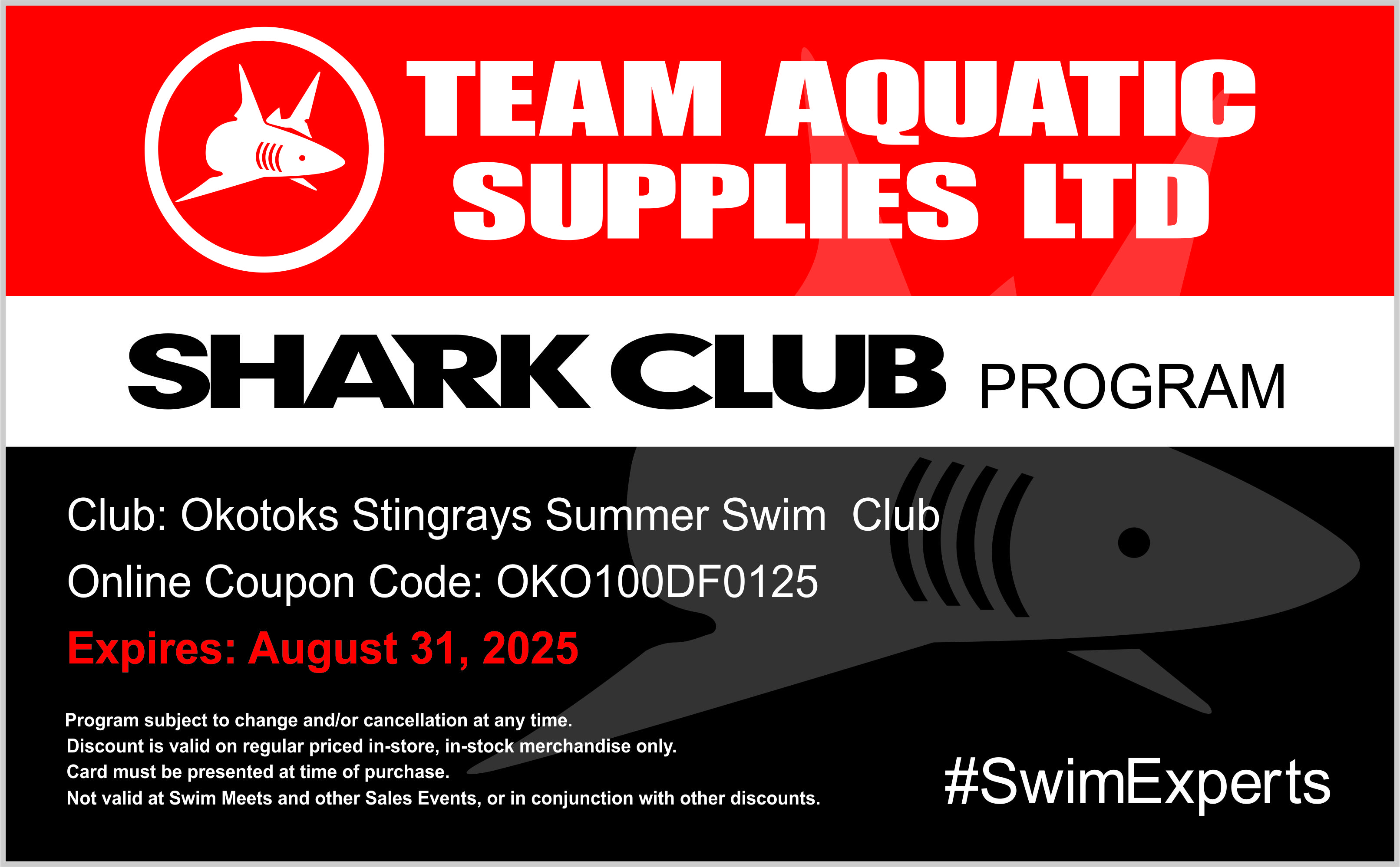 Team Aquatics is located at 6115 3 Street SE, D7, Calgary. The phone number is 403-319-2000. You must have a copy of the Shark Card on you in order to receive a discount! Online purchases are discounted using code: OKO100DF0125.