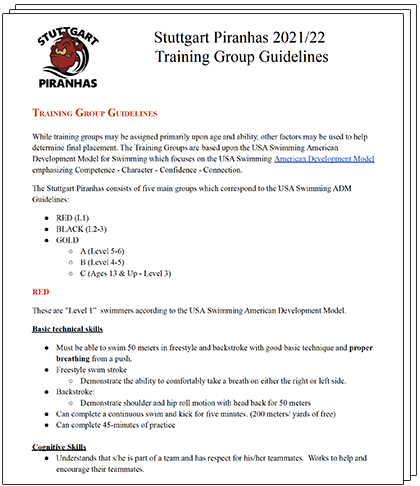 The Stuttgart Piranhas consists of five main groups which correspond to the USA Swimming ADM Guidelines. Before contacting us, please review the training group guidelines outlining the minimum the various groups which can be found here.