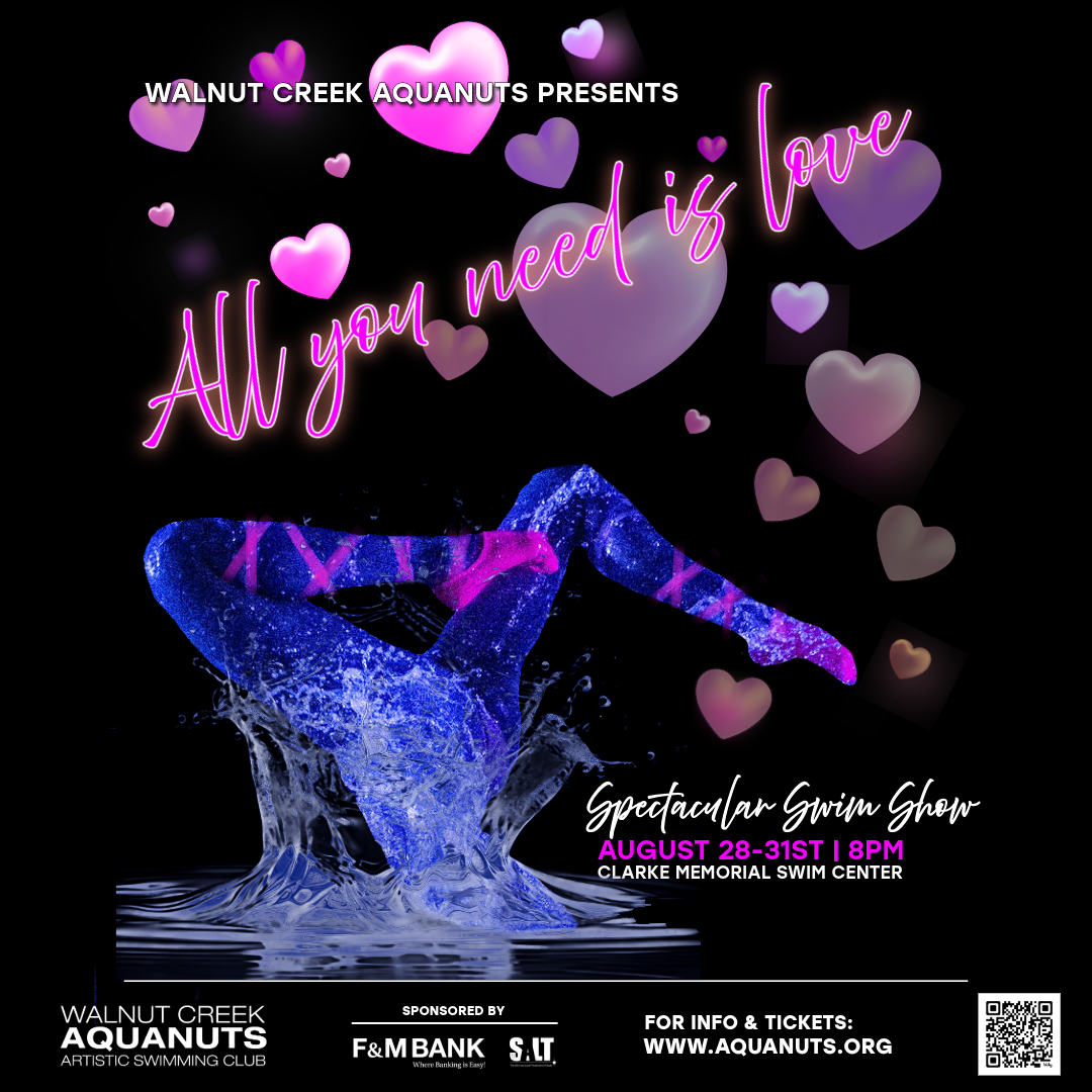 Over 100 athletes, coaches, and parent volunteers collaborate each year to put on the Walnut Creek Aquanut Fall Artistic Swimming Show! This year will mark the 56th anniversary of the Walnut Creek Aquanuts! The iconic production showcases artistic (synchronized) swimming in a theatrical format complete with lights, props, a monumental 3-D stage, and glittering costumes. The show features a Jumbo screen as a backdrop to enhance the special effects as well as provide opportunities to feature sponsorship and advertising messages.