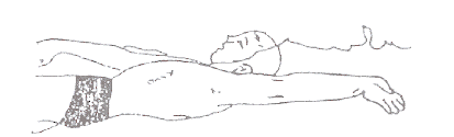 Upper view of professional backstroke movement In the initial position, the swimmer lies flat on his back, arms stretched forward, and legs extended backwards.