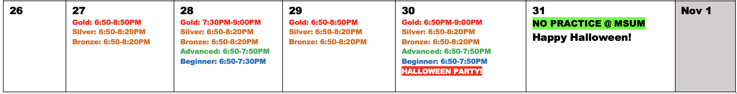 We have practice Monday - Thursday at MSUM this week! We do not have practice on Friday due to Halloween!!! GOLD: Please note you start practice at 6:50PM on Thursday!
