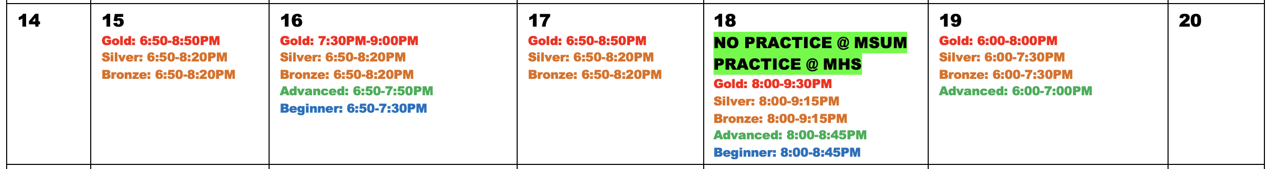 We have practice Monday - Friday. Monday, Tuesday, Wednesday, and Friday will be at MSUM. Thursday will be at the Moorhead High School. Please do not arrive before 7:45PM on Thursday.