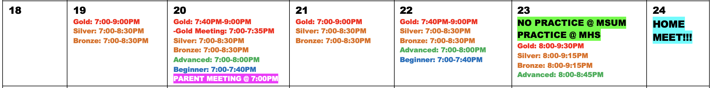 We have practice Monday - Friday this week. Friday practice is at Moorhead High. Please do not arrive earlier than 7:45PM on Friday. Gold will have a meeting at 7PM on Tuesday. Gold will be able to roll out on Thursday on the pool deck from 7:00-7:40PM