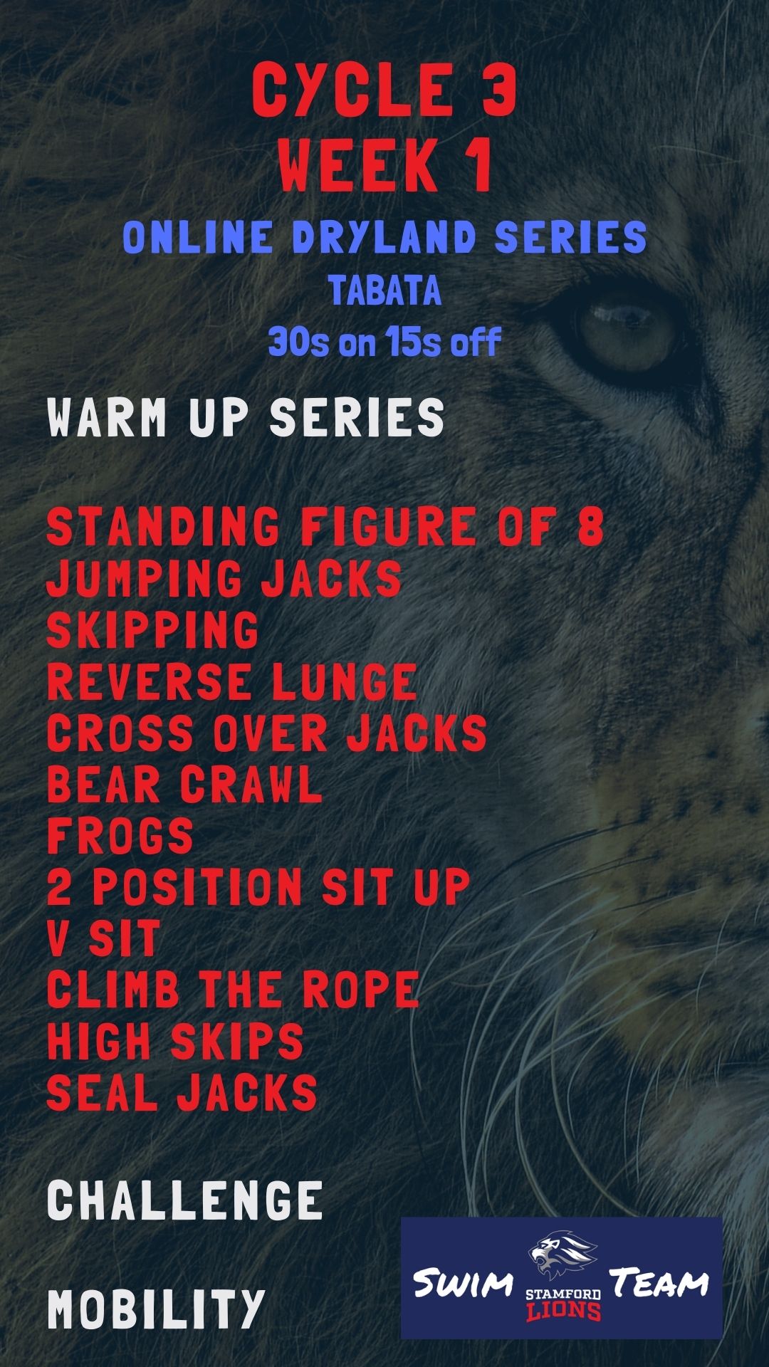We are into Cycle 3 of our online dry-land training with the introduction of our TABATA workouts! Tabata incorporates high intensity interval training with set rest intervals.