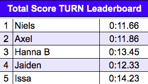 I am speed! We’ve been keeping leader boards for our starts, turns and finishes. The leader board is based on % improvement rates as the weeks progress. Here are our top 5 for our FR turns!