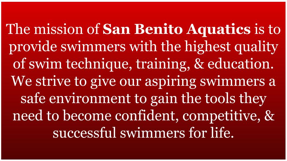 USA Swimming and San Benito Aquatics are committed to providing a safe enviornment for all participants. San Benito Aquatics has put athlete protection policies and guidelines in place. You can find more information on our Safe Sport page here.