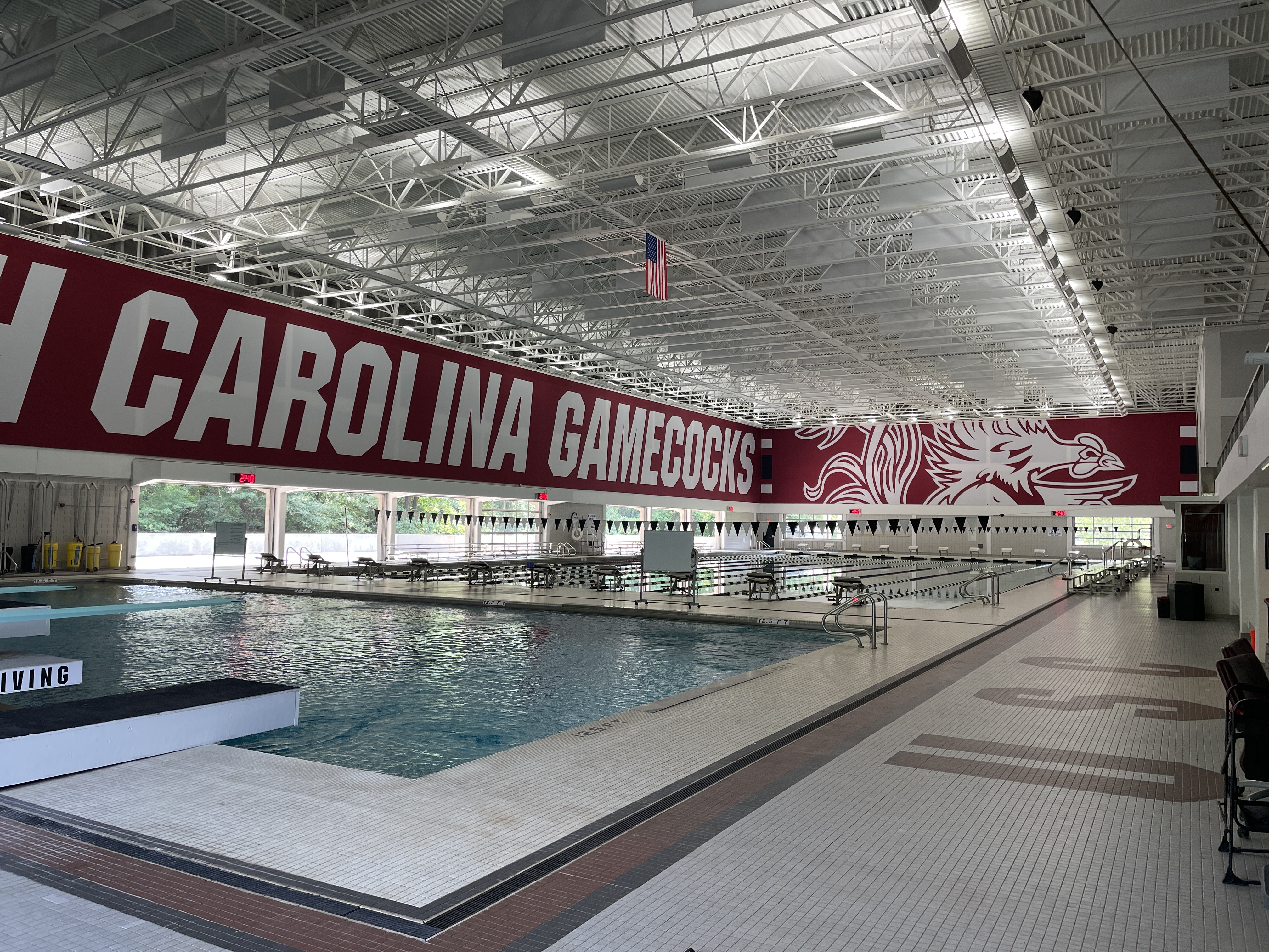 - Featuring 12 solid electronic moveable doors throughout the natatorium, when open Gamecock swimmers have the opportunity to practice under simulated natural conditions. The doors also open to a beautiful sun deck that allows athletes to take full advantage of the warm South Carolina sunshine.