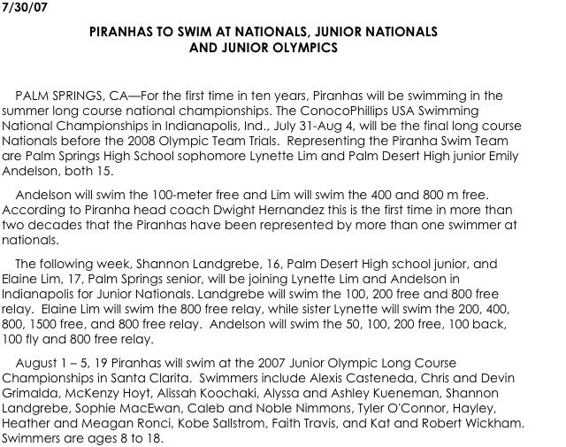 PIRANHAS TO SWIM AT NATIONALS,JUNIOR NATIONALS AND JUNIOR OLYMPICS