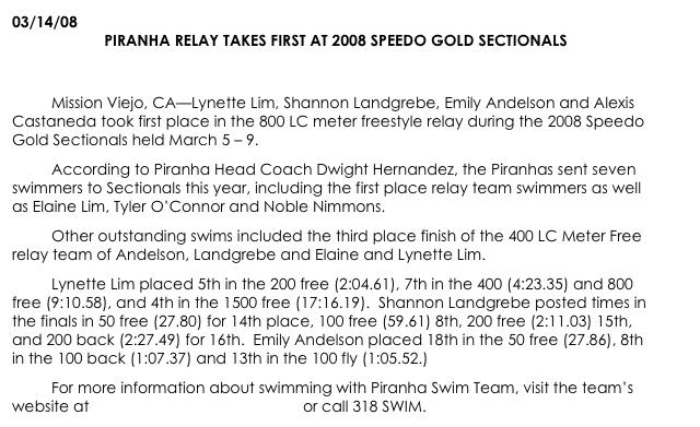 PIRANHA REALY TAKES FIRST AT 2008 SPEEDO GOLD SECTIONALS
