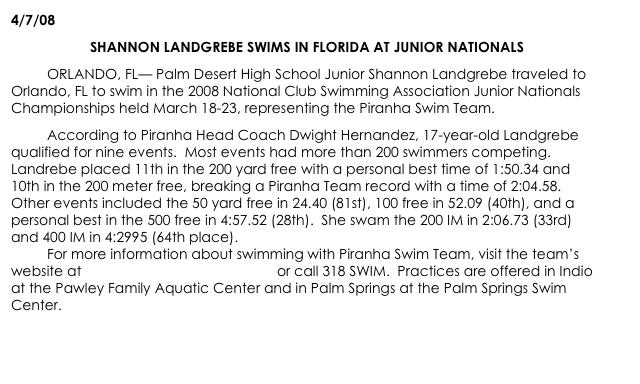 SHANNON LANDGREBE SWIMS IN FLORIDA AT JUNIOR NATIONALS