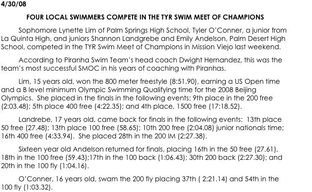 FOUR LOCAL SWIMMERS COMPETE IN THE TYR SWIM MEET OF CHAMPIONS