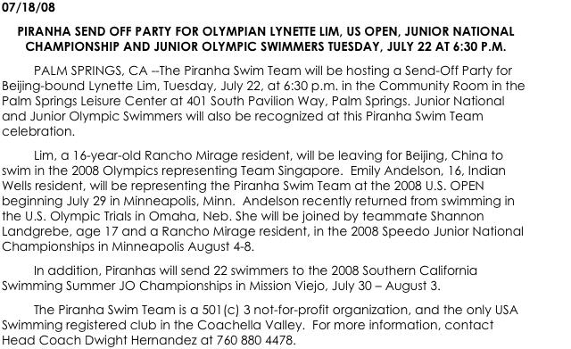 PIRANHAS SEND PARTY FOR OLYMPIAN LYNETTE LIM/US OPEN ,JUNIOR NATIONAL CHAMPIONS