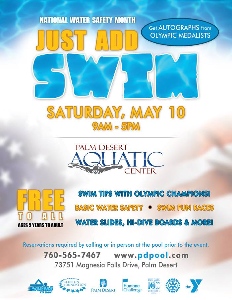 Saturday May 10th the Swim to Win Foundation and the Family YMCA of the Desert is hosting "Just Add Swim" day at the Palm Desert Aquatics Center. 8 Olympians will be offering Swim Instruction, signing autographs, and providing information about aquatics from 9 am to 5pm FREE OF CHARGE. The goal of the event is to increase water safety awareness and encourage more people to be involved in aquatic sports. The in water lessons being done by Olympians are focusing on lifesaving and beginner swimming skills, but anyone can sign...