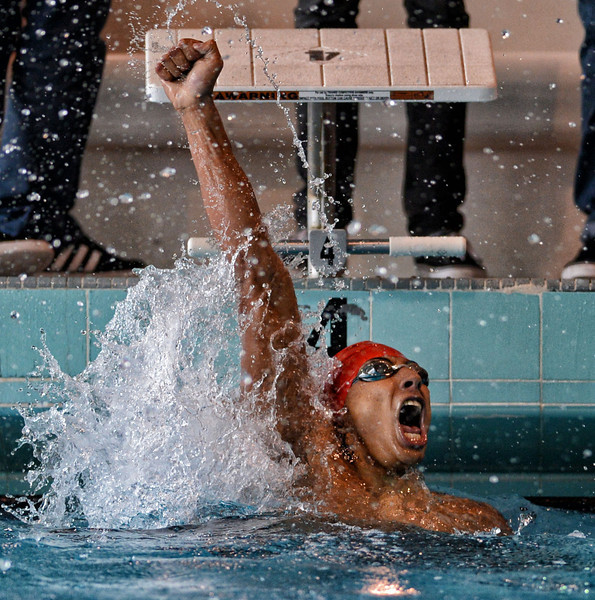 Yoessef Tibazi celebrates after breaking a 30 year old record in the 100-yard Fly (49.96Y) at the 2013 CIF City Championships.