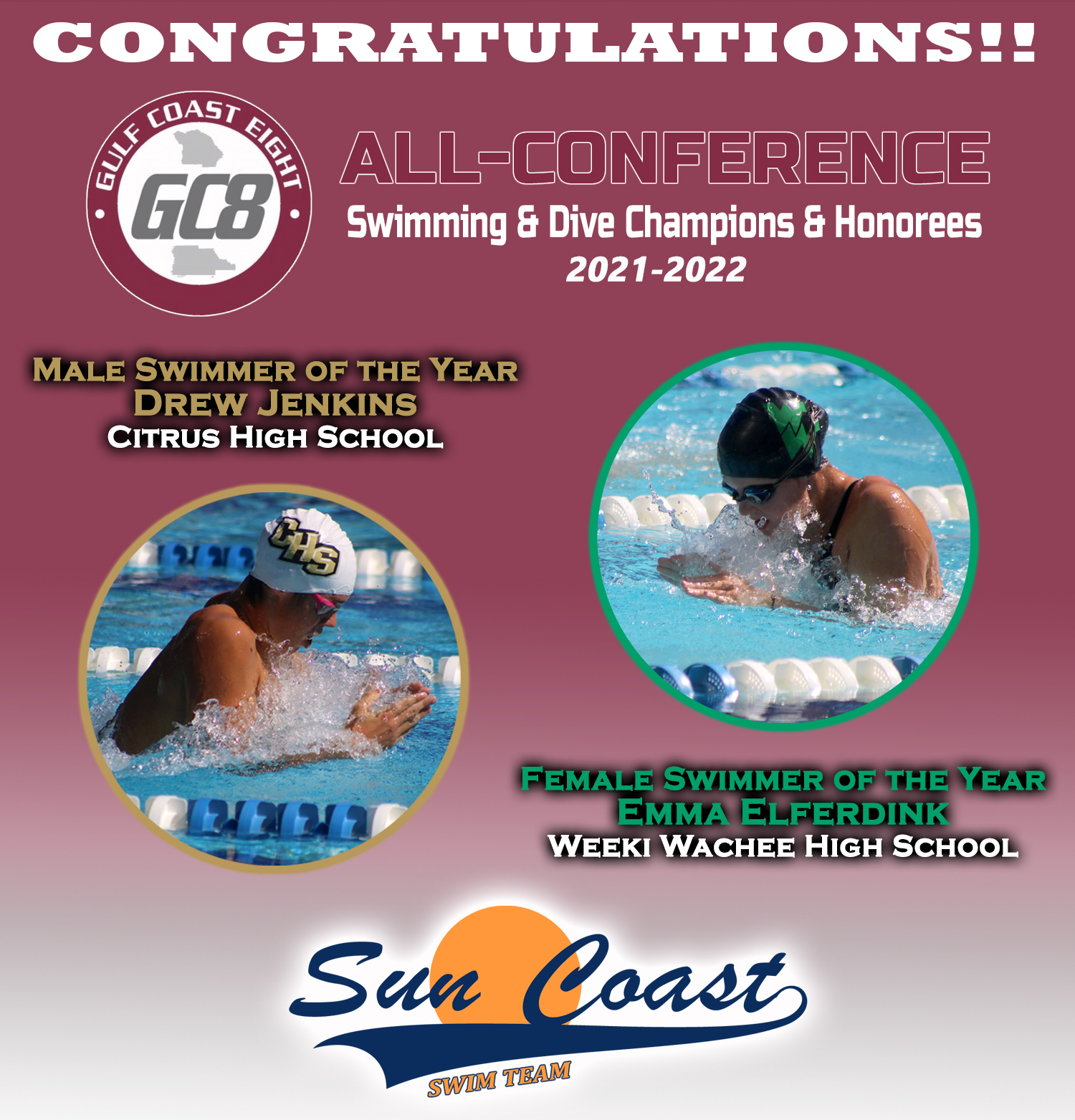 Congratulations to Sun Coast Swim Team swimmers, Emma Elferdink (WWHS) and Drew Jenkins (CHS) on being awarded 2021 GC8 Conference Swimmers of the Year!!!