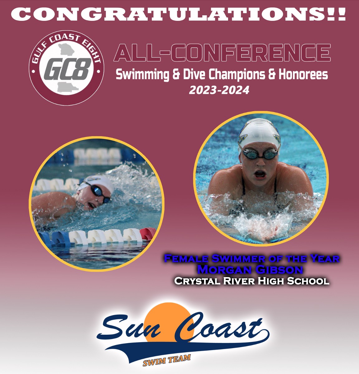 Exciting news from the Gulf Coast 8 (GC8) Athletic Conference – our very own Sun Coast Swim Team's, Morgan Gibson, has been named the GC8 Girls Swimmer of the Year!