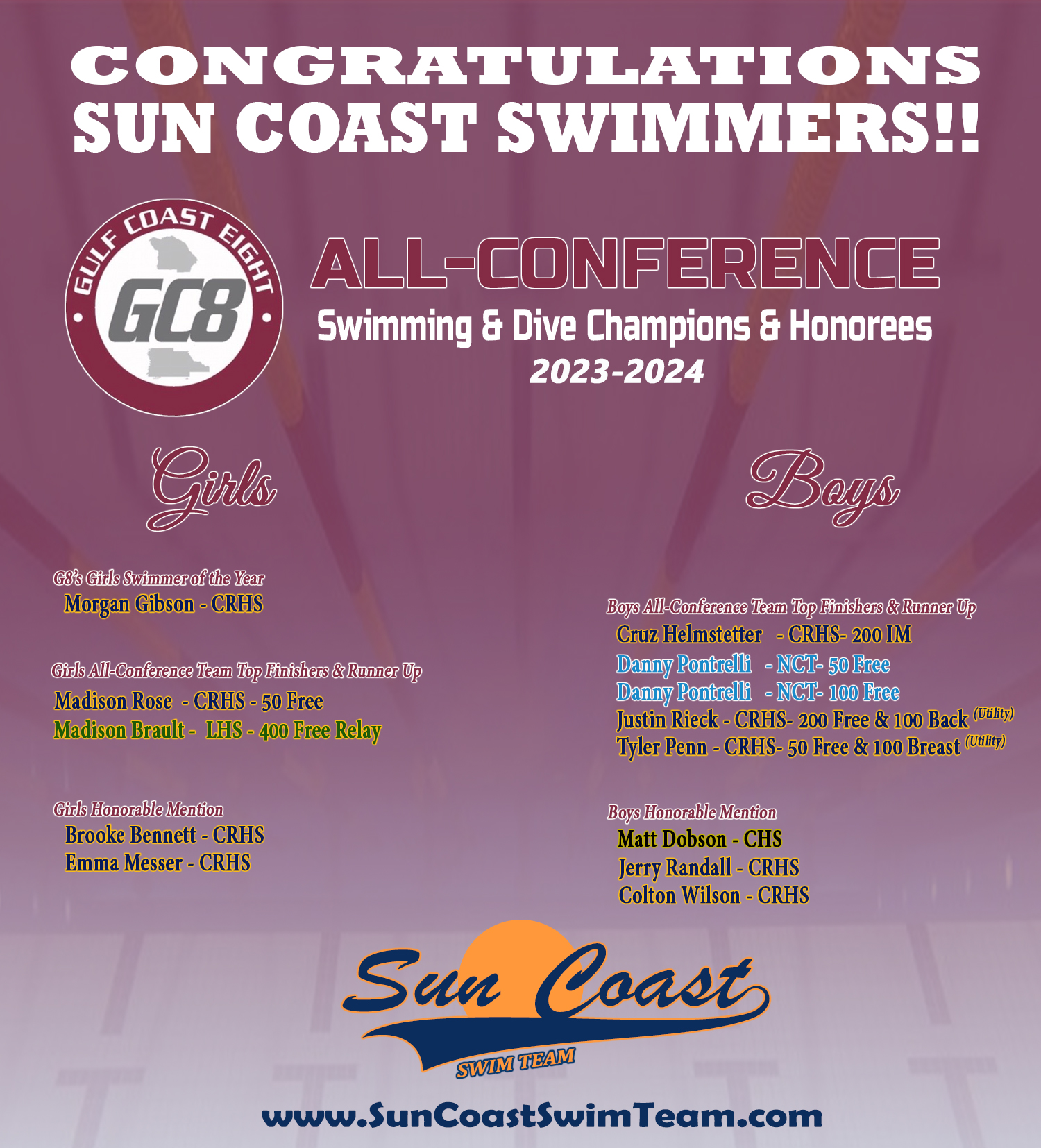 The entire Sun Coast Swim Team, comprising these exceptional student-athletes from various high schools, stands united in their commitment to excellence. The GC8 Fall All-Conference selections are a testament to their hard work, skill, and sportsmanship, reflecting the spirit of teamwork and achievement that defines the Sun Coast Swim Team. Congratulations to all honorees for this well-deserved recognition of their outstanding contributions to the world of high school swimming.