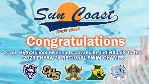 Sun Coast Swim Team's Outstanding Swimmers Shine at 2023 FHSAA 2A State Championships The 2023 FHSAA 2A State Swimming & Dive Championships were a spectacle of athleticism and dedication, with high school swimmers from across Florida showcasing their talents. Among the many exceptional athletes who took part, three young swimmers from the Sun Coast Swim Team stood out for their remarkable performances. Representing their respective high schools, Daniel Pontarelli from Nature Coast Tech High School, Kimberly Pinkowski from Nature Coast Technical High School, and Morgan Gibson from Crystal River, brought...