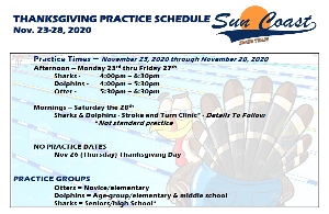 2020 Thanksgiving Practice Schedule On Saturday, Nov 28th we will be offering a Stroke and Turn Clinic for the Sharks & Dolphins. (Look for more details soon...)