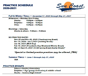 Sun Coast Swim Time Fall & Winter Schedule The SCST 2020-2021 Fall and Winter schedule starts on November 17, 2020. See below or can be downloaded by CLICKING HERE.