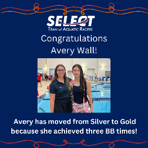 Select Swim had a great weekend at the Select November Unclassified Meet! This meet was open to all swimmers. We would like to thank all 78 swimmers from Select who signed up for this meet! We would like to recognize Kacie Craver, Cade Daigle, Bryn McCormick, Liliana Vasquez, Avery Wall, Paeton Williams, and Samantha Zavala who achieved at least one "BB" time; James Case, Cade Daigle, Bryn McCormick, Chris Pepler, and Samantha Zavala who achieved at least one "A" time; and James Case who achieved least one new "AA" time....