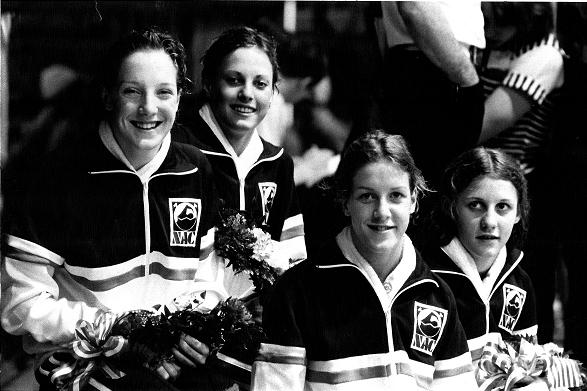 The American Record setting relay. From left to right: Amy Caulkins, Joan Pennington, Tracy Caulkins, Karinne Miller. Courtesy of Marjorie Shuer, Durham, NH