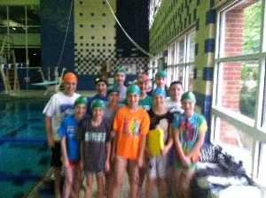 Great turnout for the 14th Annual Blue Group Swim with your Clothes practice. This Saturday morning was full of fun and interesting swimming. Practice got started with April modeling some of Coach Dahlke's nicer clothes. Warmup with clothes on was challenging for all swimmers. Fun 25's were very interesting - with backward freestyle being the high light.