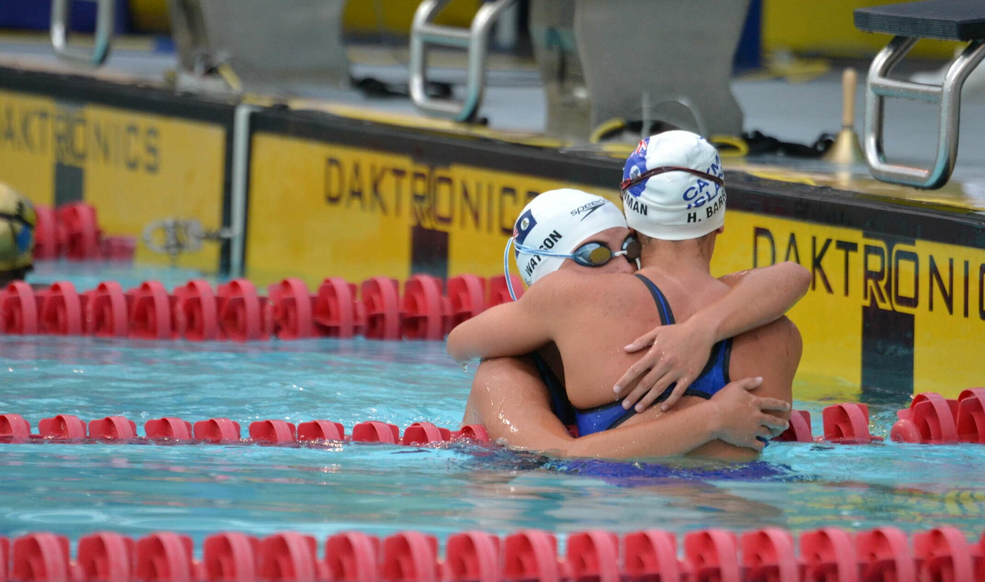 After the race, she embraced fellow competitors in the lanes next to her, including Cayman’s Riley Watson, who took bronze in the 13-14 age group for that event.