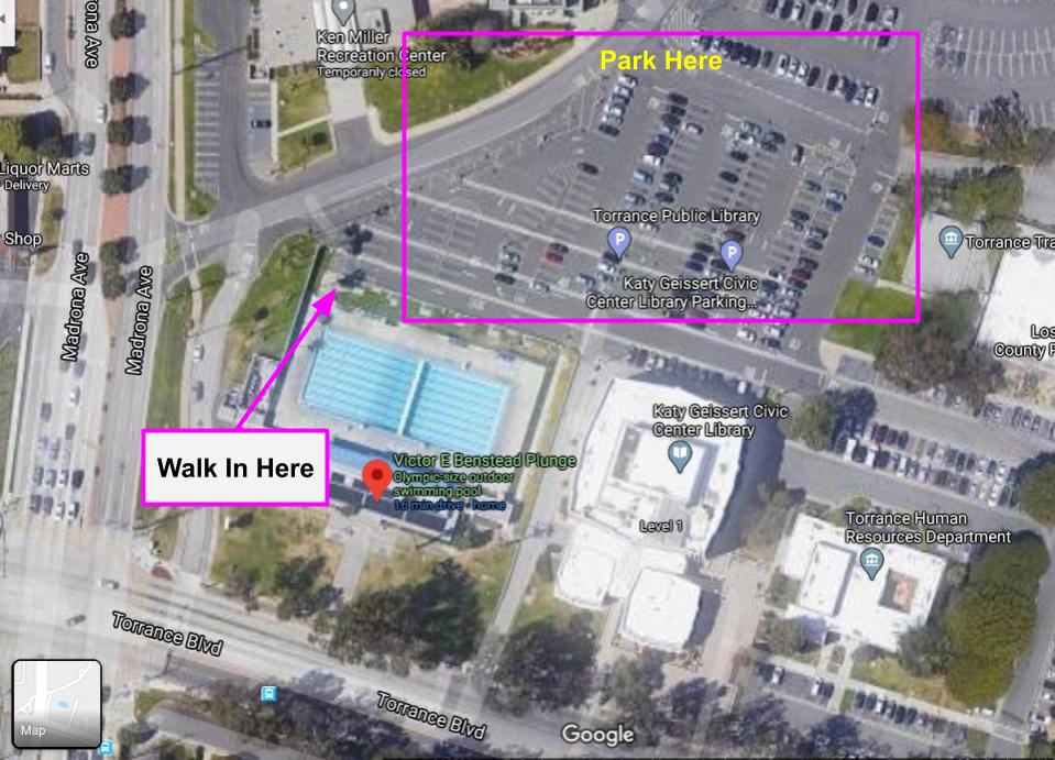 We swim at the Victor E. Benstead Plunge (The Plunge) on Saturdays in Torrance located at the corner of Torrance Blvd and Madrona Avenue. There is plenty of free parking in the lot next to the pool.