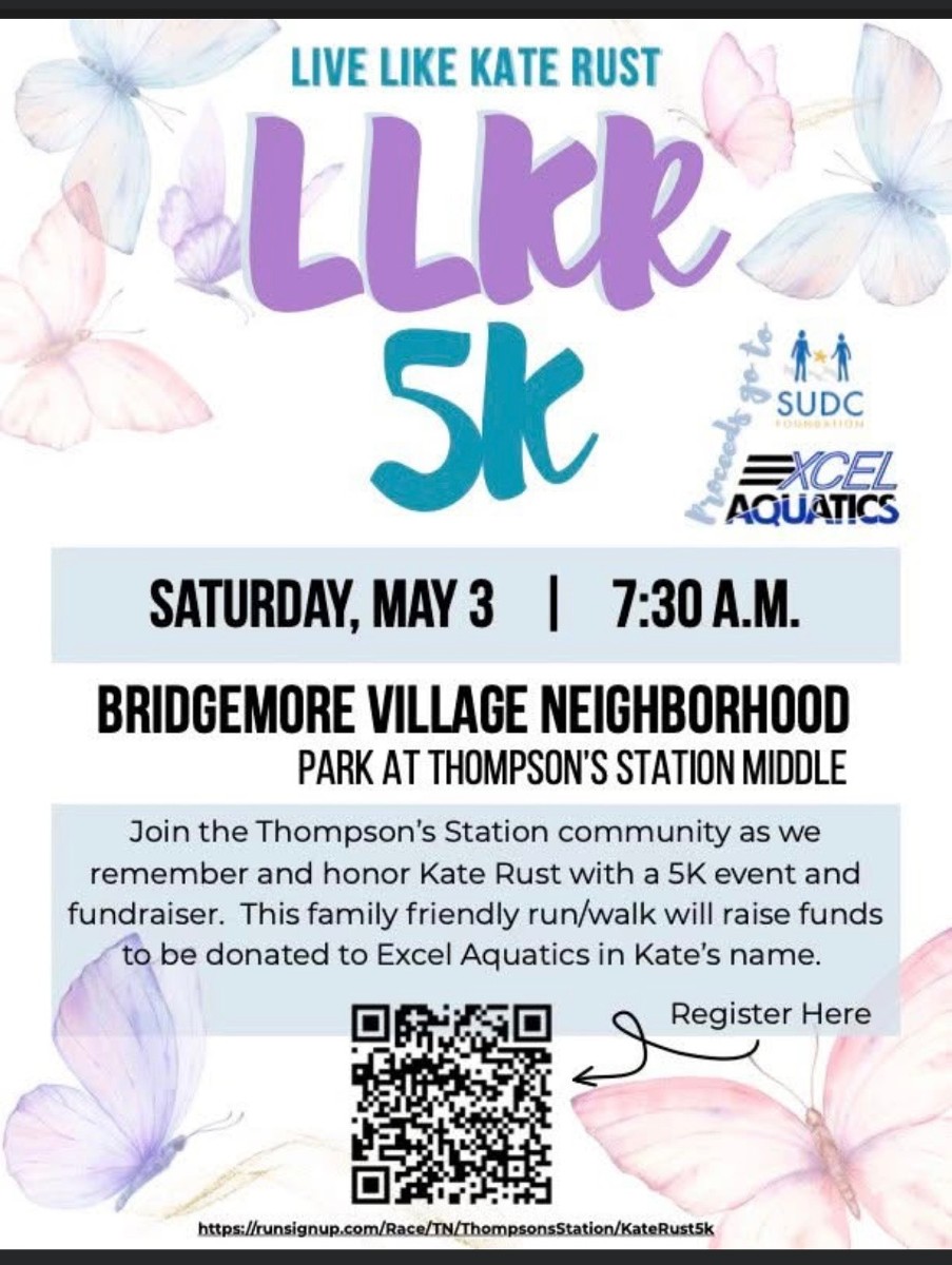 The first annual LLKR (Live Like Kate Rust) 5k race will be held on Saturday, May 3rd at the Bridgemore Village Neighborhood Park in Thompson's Station. The event is being held in honor of Excel Swimmer and TSMS Cross Country Runner Kate Rust who passed away unexpectedly in September.
