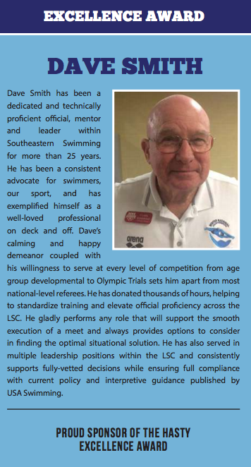 This USAS award honors an outstanding LSC official for their contribution to local swimming. The award is sponsored by Swimming World Magazine and Hasty Awards.