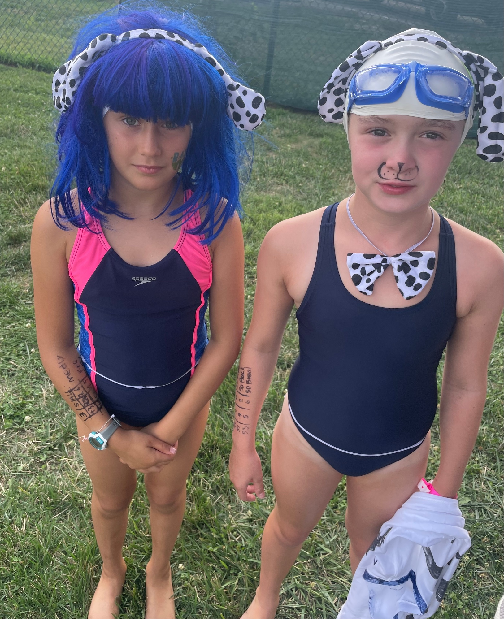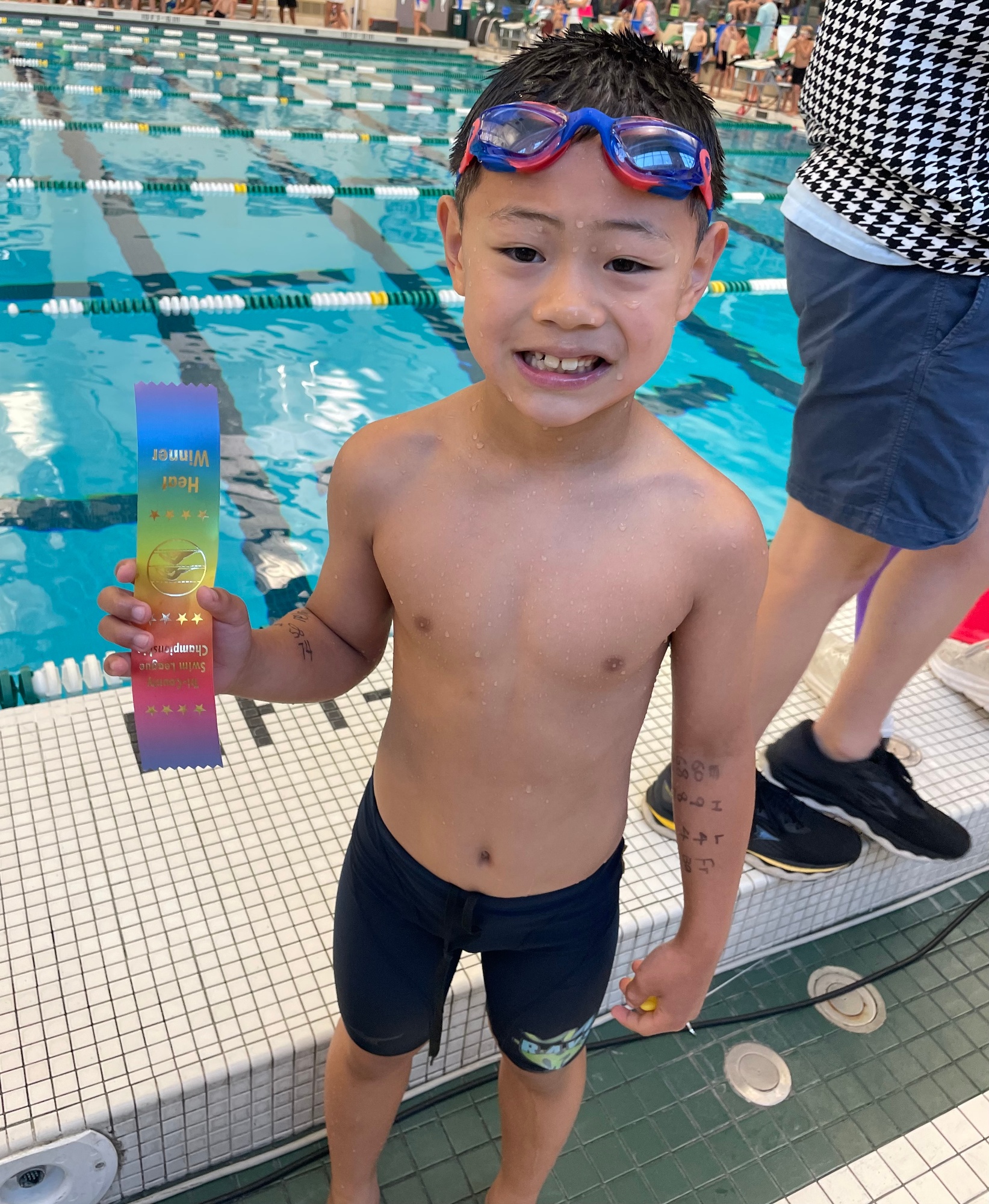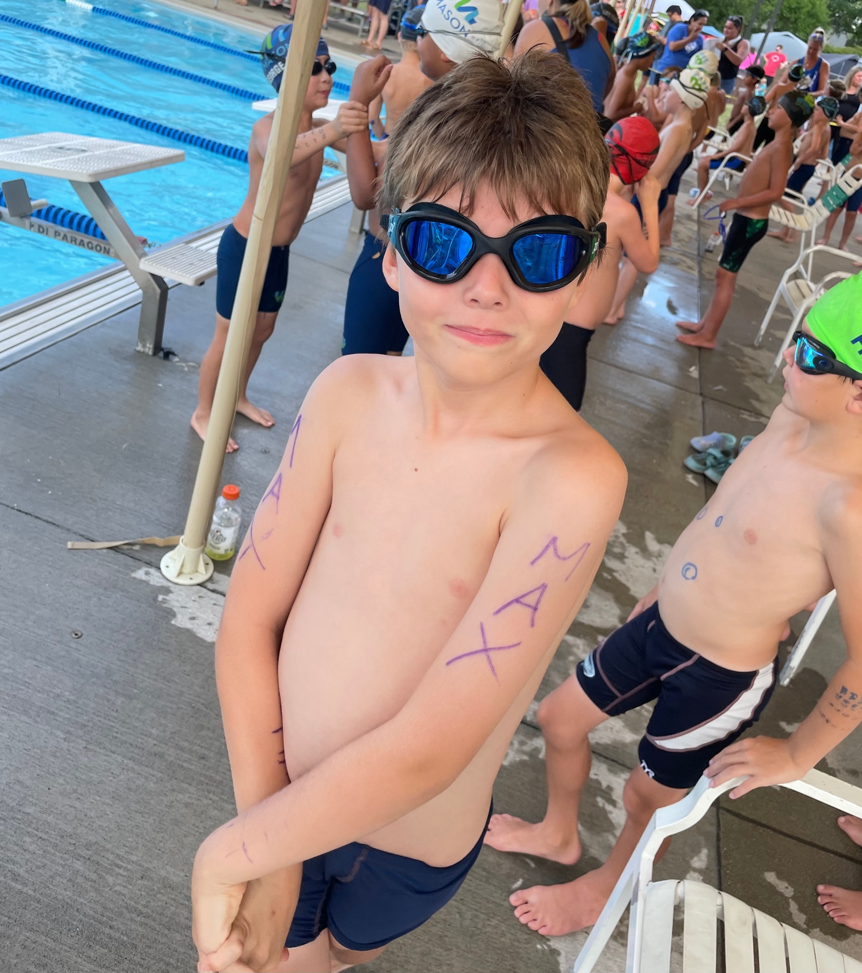 Here is an example of how to write your Swimmer's info on their arm for Swim Meets. This is recommended for all 10&Under swimmers...