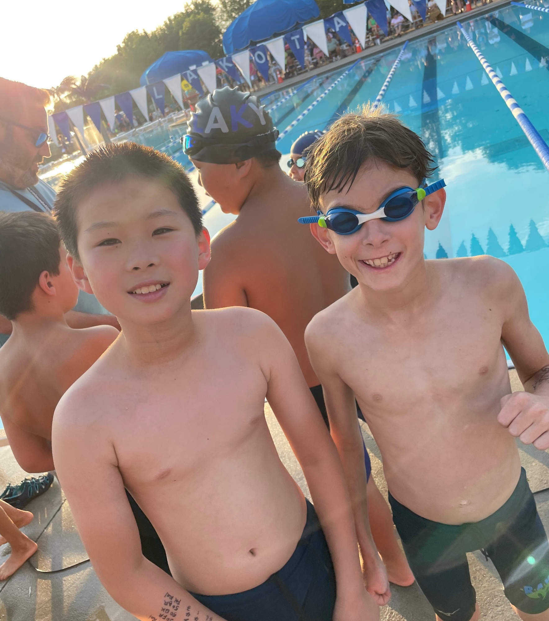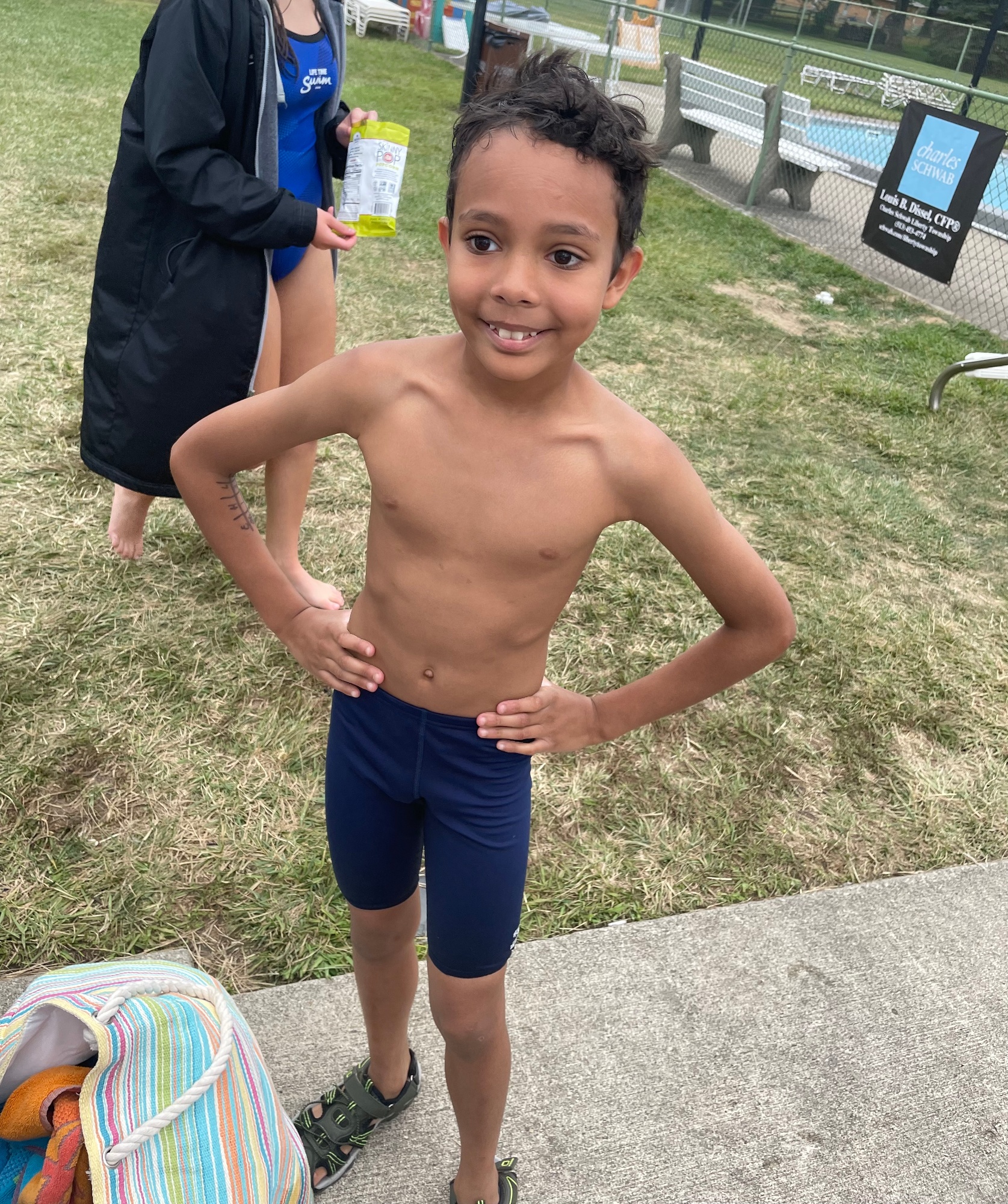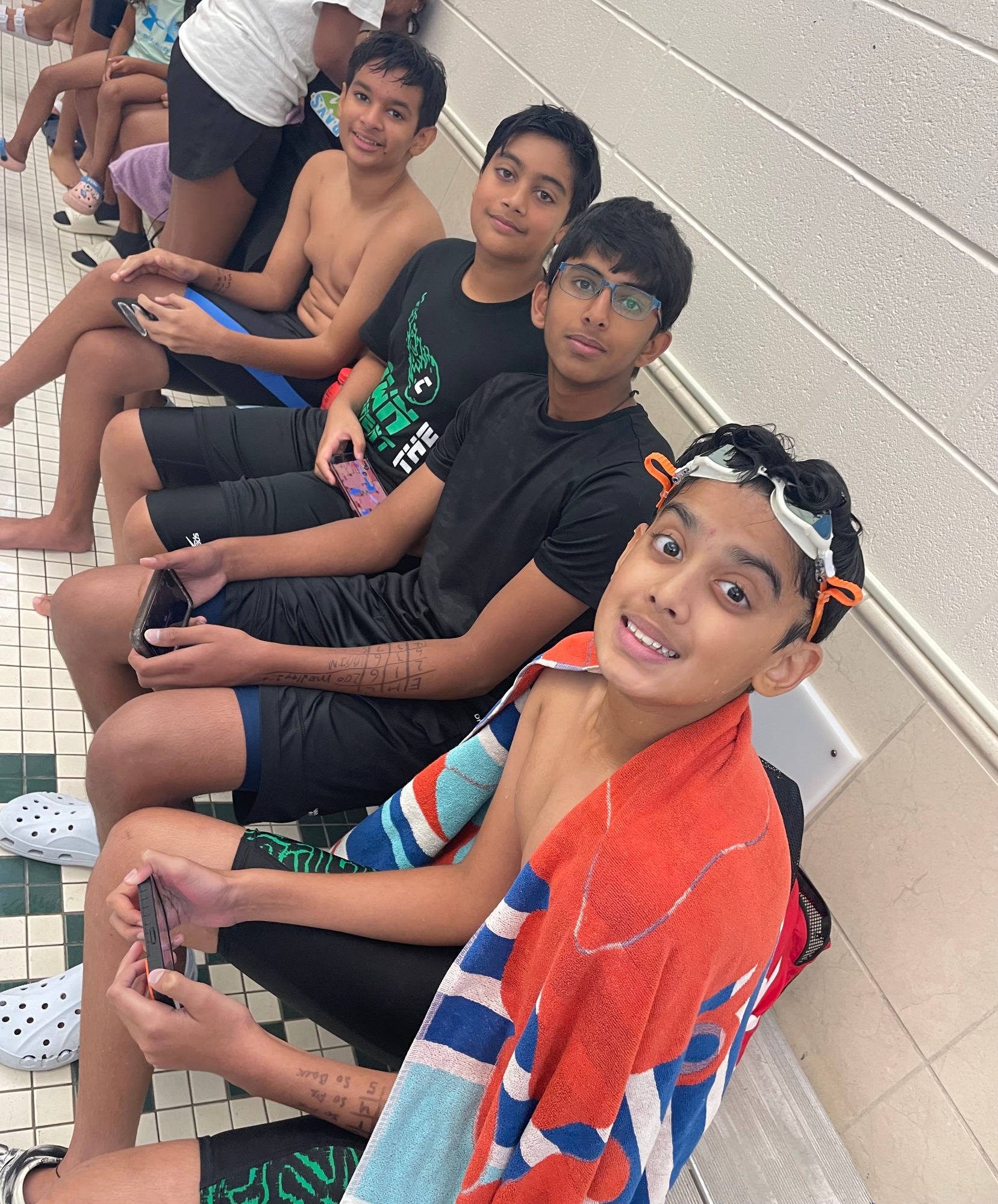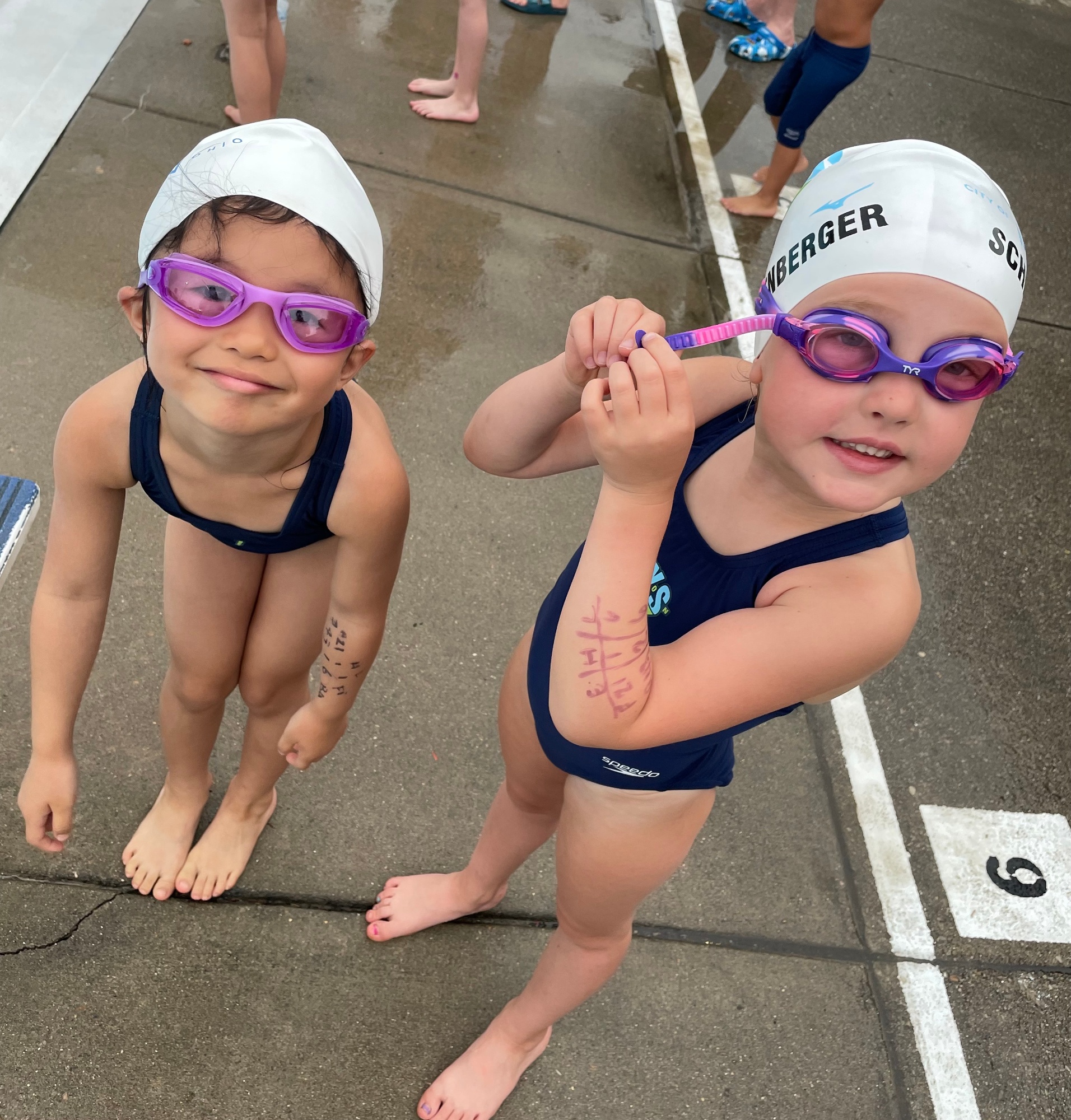 Here is an example of how to write your Swimmer's info on their arm for Swim Meets. This is recommended for all 10&Under swimmers...