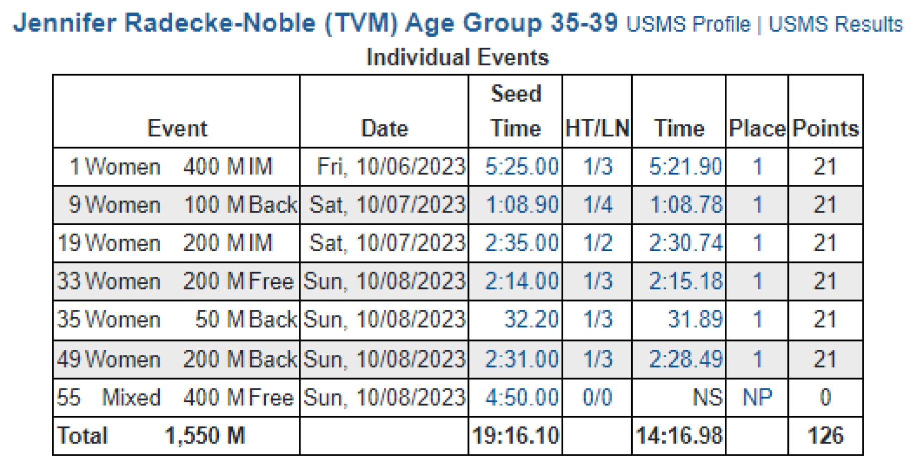 Jen Radecke-Noble, one of our star swimmers, recently competed in the 2023 Pacific Masters Swimming Kerry O'Brien Short Course Meters Championships this past weekend. And let me tell you, she absolutely crushed it! Jen entered six events, and in each one, she took home the gold, clinching 1st place. But that's not all - she also shattered not one, not two, but three Pacific Masters Swimming records! Jen, your passion for swimming and your exceptional talent continue to inspire us all.