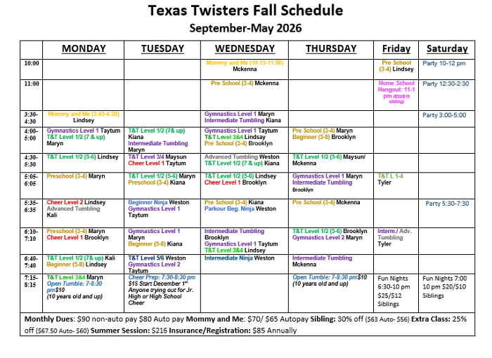 Twisters offers classes for all ages and levels. Starting at Mommy and Me up to Competition cheerleading, tumbling and gymnastics.