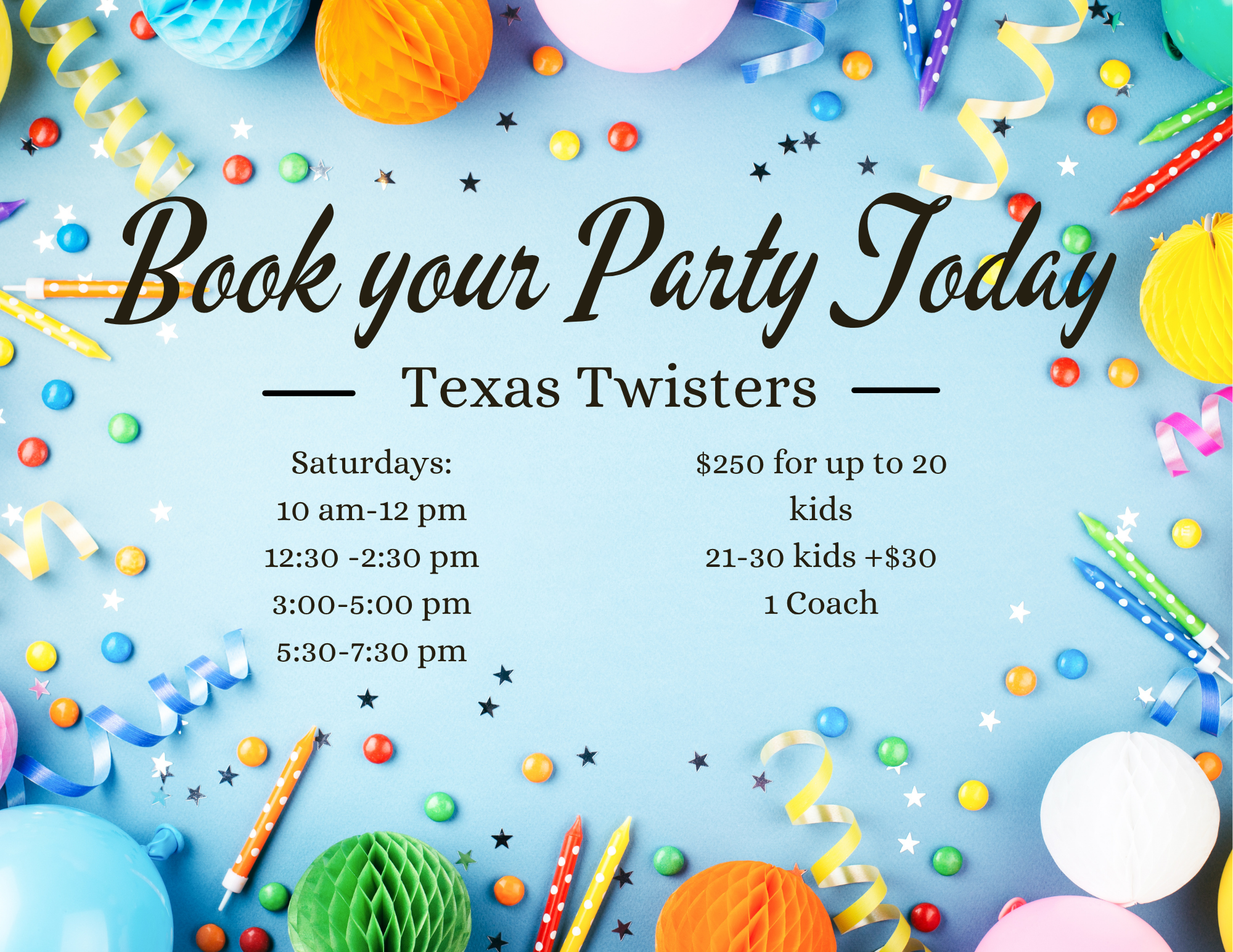 Parties are 2 hours for $250 for up to 20 kids and an extra $30 if an additional coach is needed.