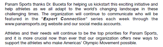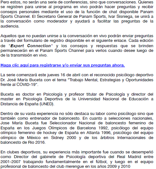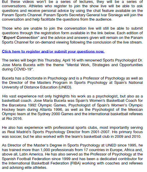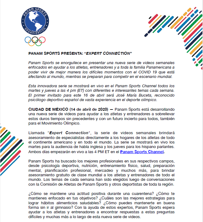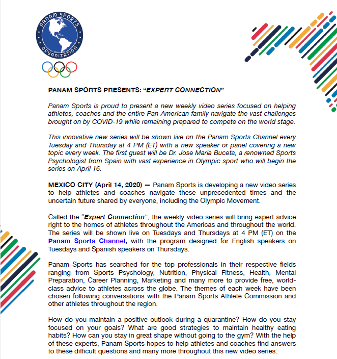 With regard to the weekly video series called the “Expert Connection” that Panam Sports started last week to bring expert advice focused on helping athletes, coaches and the entire Pan American family navigate these unprecedented times brought on by COVID-19, we would like to inform you that the first program for English speakers will be aired on Tuesday, April 21, 2020 at 4:00 PM EST (Miami time) on the Panam Sports Channel.
