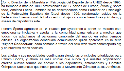 La primera sesión en español será este jueves 16 de abril a las 4 pm ET con el reconocido psicólogo deportivo Dr. José María Buceta con el tema “Trabajo Mental, Estrategias y Oportunidades frente al COVID-19”. Buceta es doctor en Psicología y profesor titular de Psicología y director del master en Psicología Deportiva de la Universidad Nacional de Educación a Distancia de España (UNED).