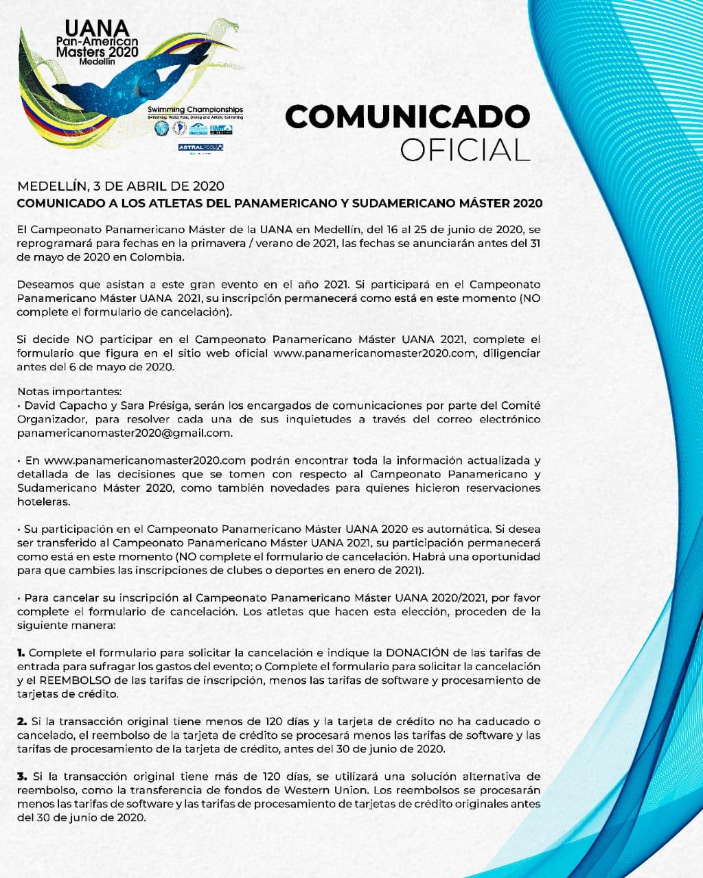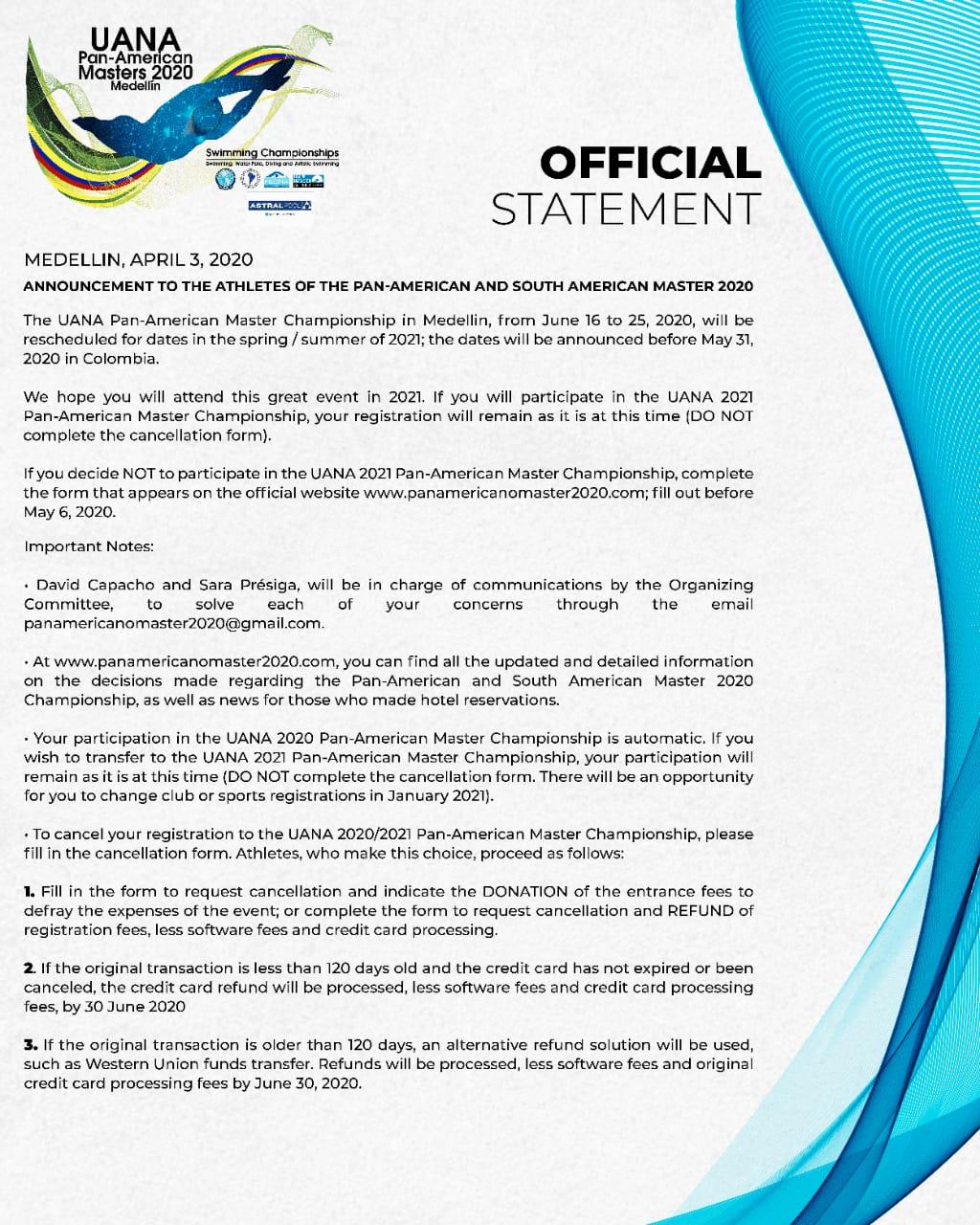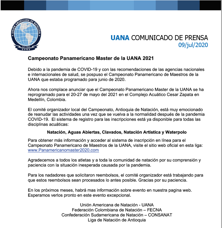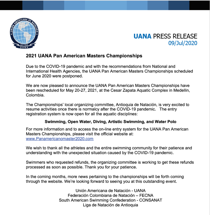 Press Release from LOC Medellin 2020 in regards to the 2020 UANA MASTERS Championships. As of today, March 13, 2020 the Championship will continue as scheduled