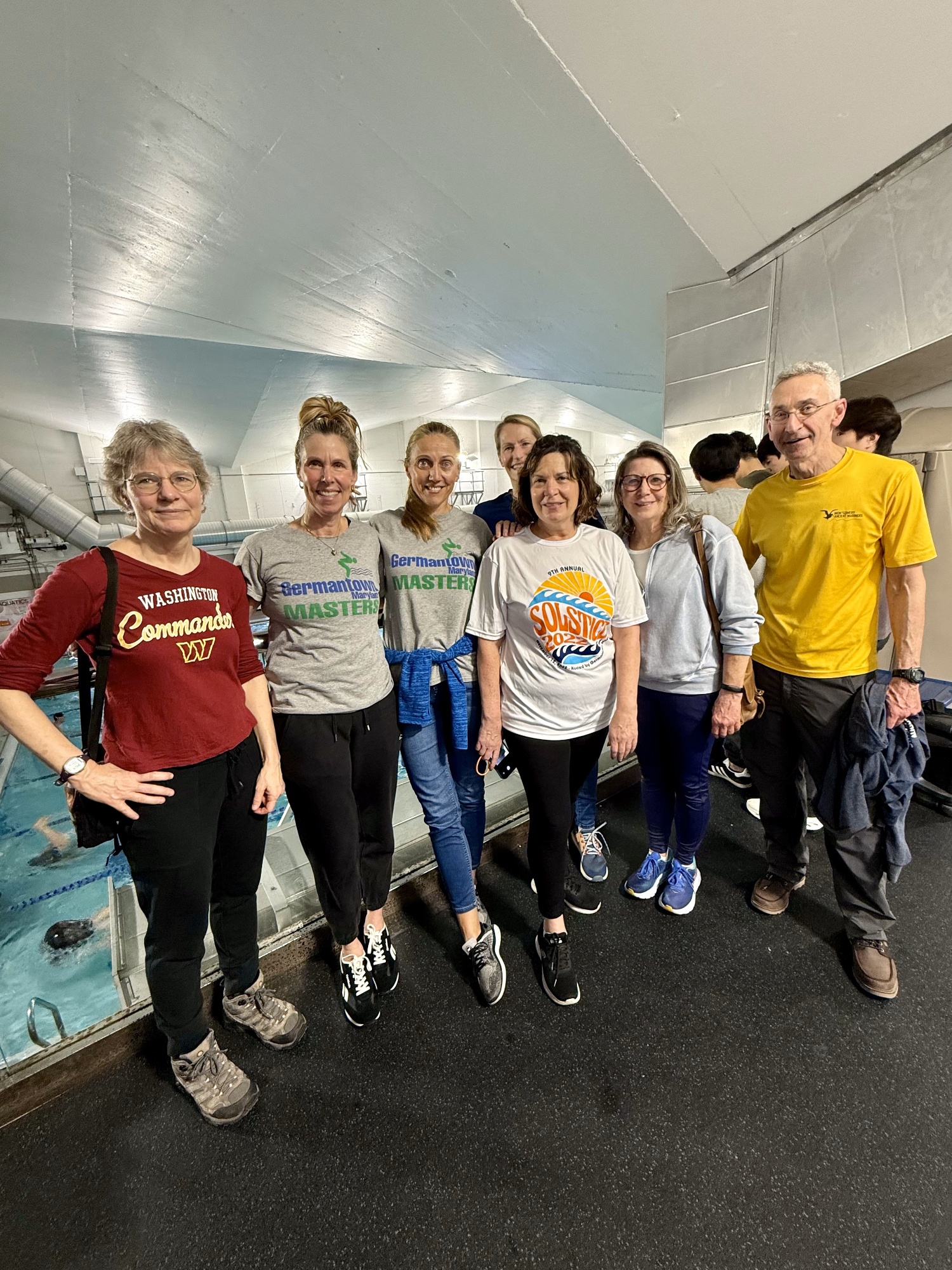 GWU Swim Team helped us in a big way in November by providing timers for our SCM meet at Germantown Indoor Swim Center.  Last month a group of GERM and Ancient Mariner swimmers attended a GMU meet in DC.  Cathy Gainor, Carole Valis, Dorota Hassett, Denise Dombay, Lisa Yaw, Amy Cooley and Tom Denes are pictured, left to right.