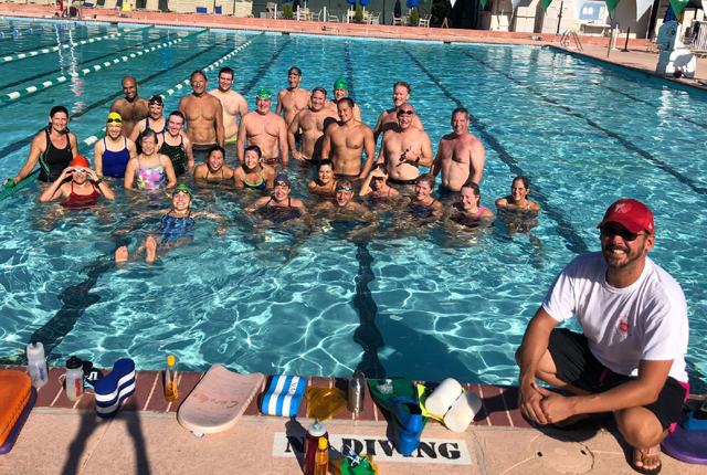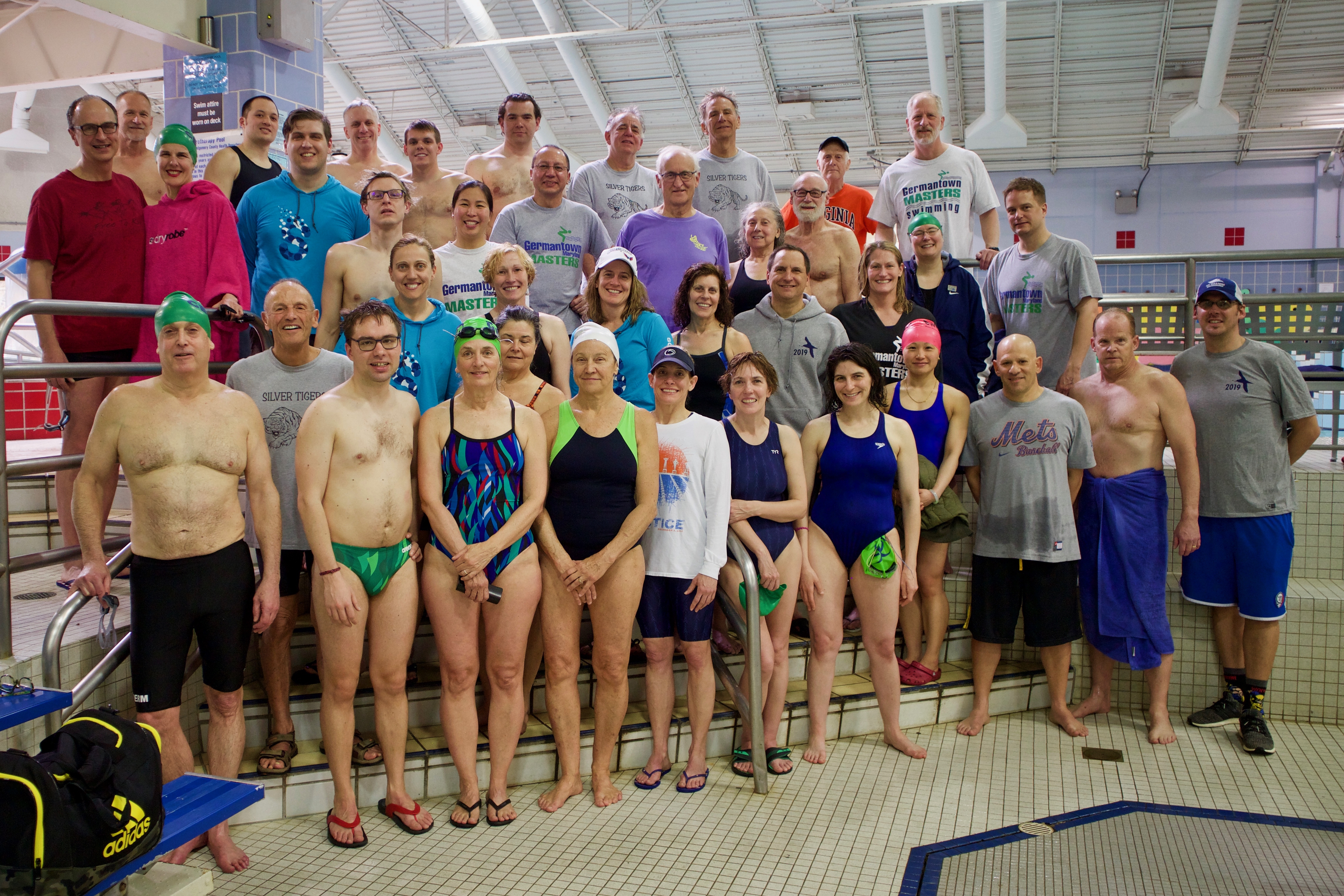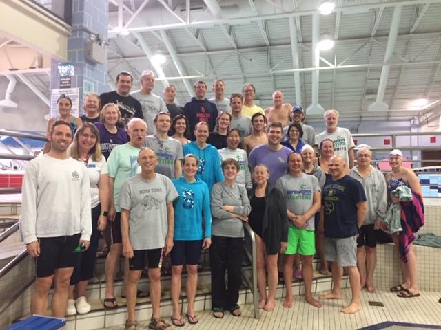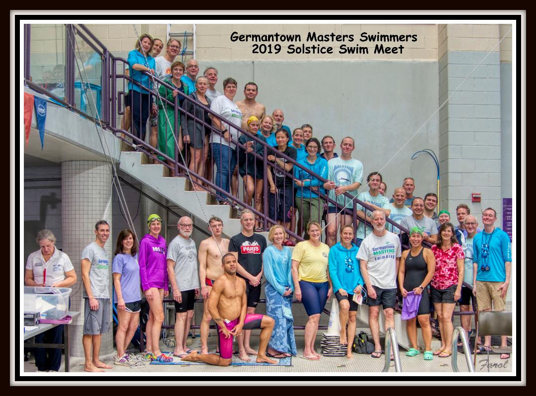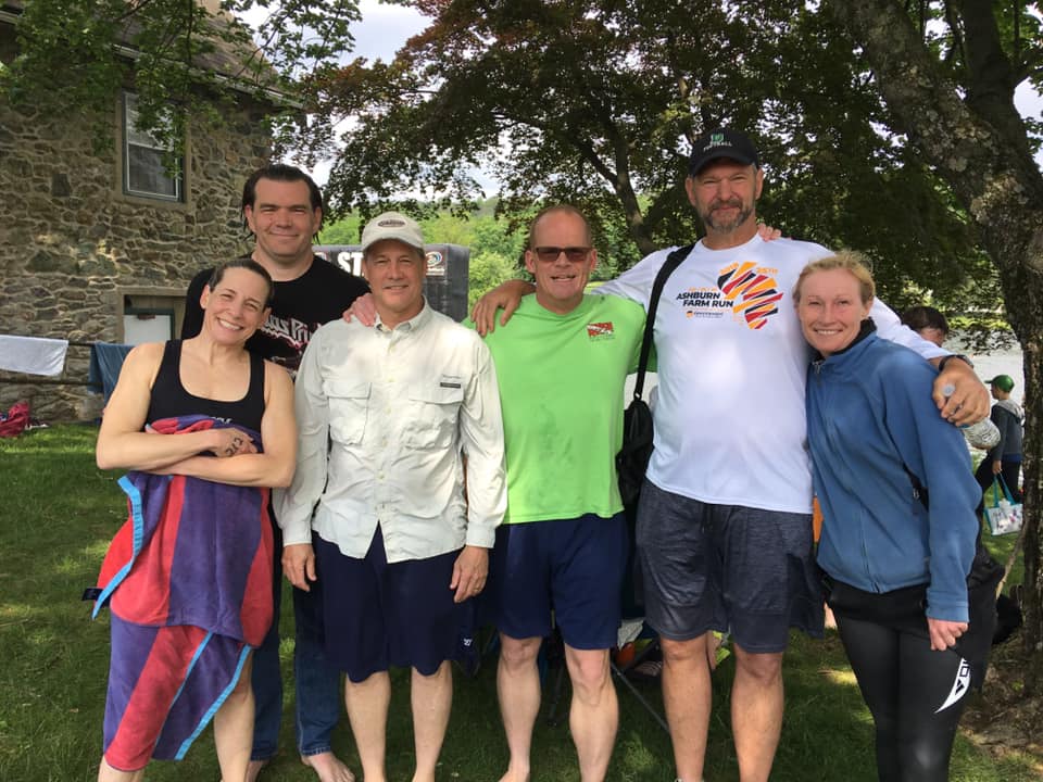 Below:  Some GERM Swimmers at Fort Richie Swim Fest 2019:  Caren Bancroft, Bryan Main, Dave Ruf, Mark Young, Jim Rill, Johanna Schneider