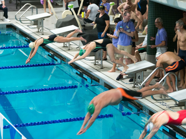 Above:  Women's 800m Free Relay at 2019 Solstice:  Lisa Chin, Denise Dombay, Terri Postma, Dorota Hassett