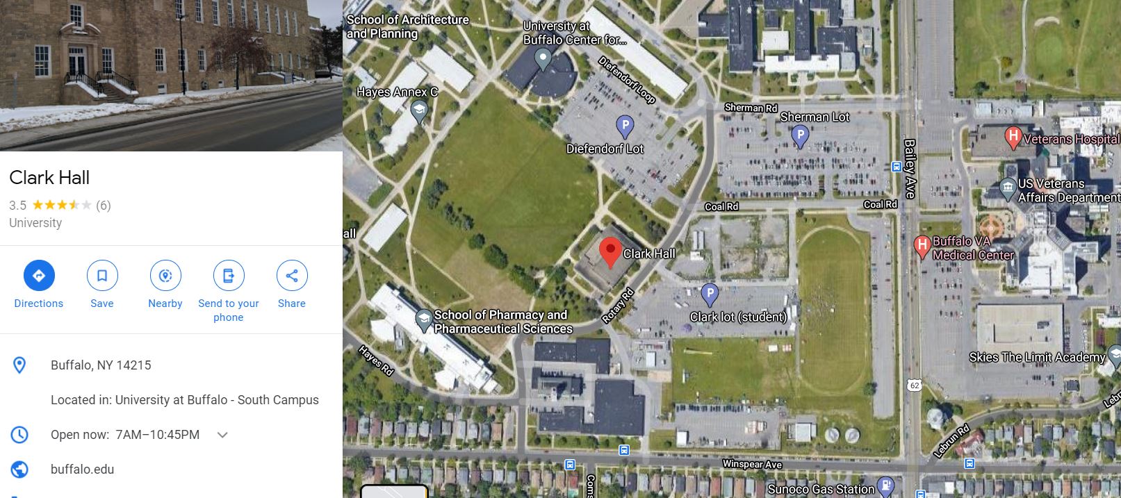 We are also practicing at Clark Hall on the University at Buffalo South Campus. It is located on Rotary Rd near the Bailey Ave and Winspear Ave intersection.
