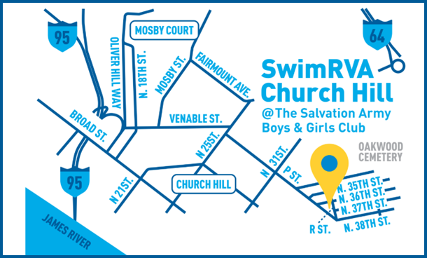 SwimRVA Church Hill is a newly re-modeled indoor aquatics center equipped with a beautiful 6-lane, 25-yard competition pool. Located in the heart of Church Hill, SwimRVA has partnered with the Salvation Army Boys and Girls club to offer another opportunity for aquatic access in Richmond,s East End. The comfy feel and private pool, is perfect for another developmental site for our younger swimmers.